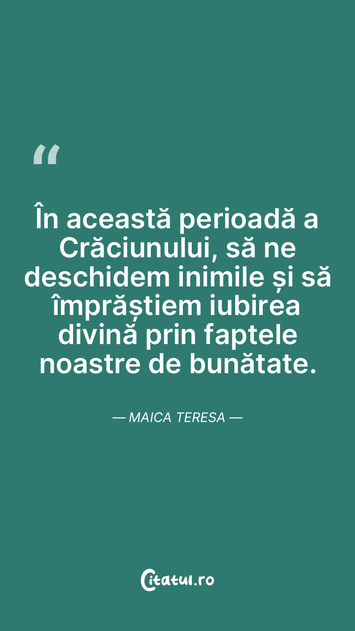 În această perioadă a Crăciunului, să ne deschidem inimile și să împrăștiem iubirea divină prin faptele noastre de bunătate. Maica Teresa