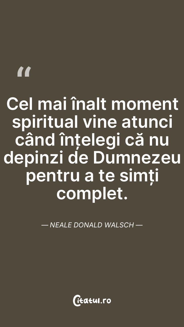 Cel mai înalt moment spiritual vine atunci când înțelegi că nu depinzi de Dumnezeu pentru a te simți complet. Neale Donald Walsch