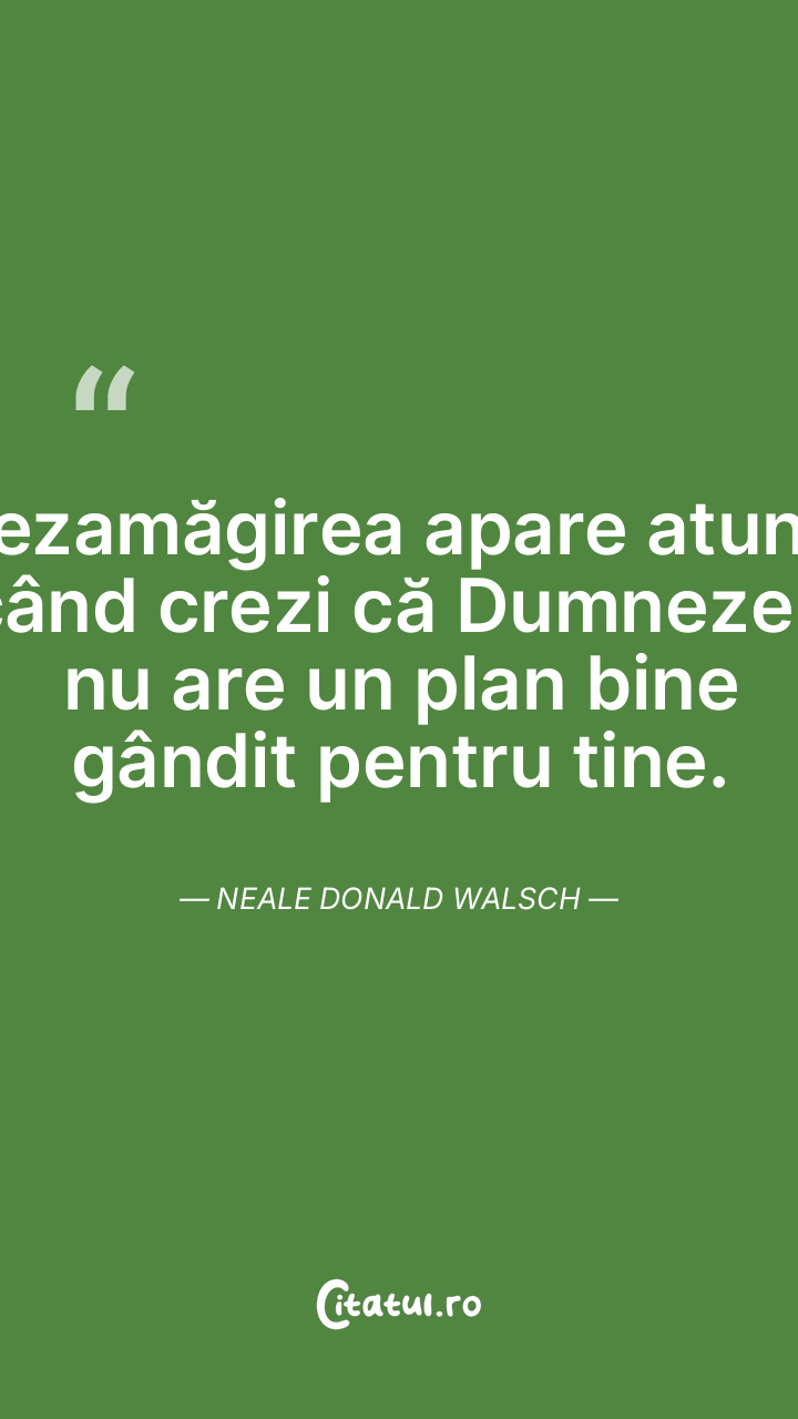 Dezamăgirea apare atunci când crezi că Dumnezeu nu are un plan bine gândit pentru tine. Neale Donald Walsch