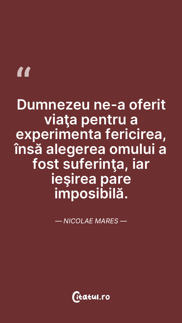 Dumnezeu ne-a oferit viaţa pentru a experimenta fericirea, însă alegerea omului a fost suferinţa, iar ieşirea pare imposibilă. Nicolae Mares