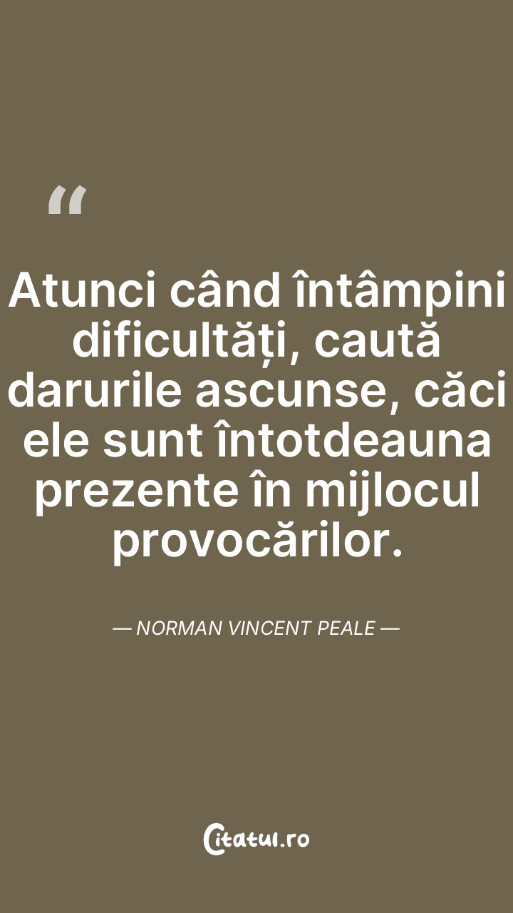 Atunci când întâmpini dificultăți, caută darurile ascunse, căci ele sunt întotdeauna prezente în mijlocul provocărilor. Norman Vincent Peale