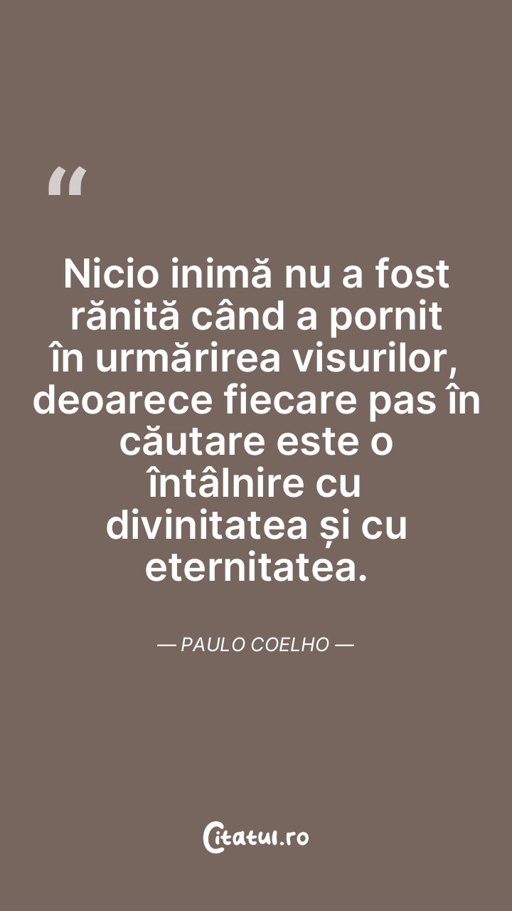 Nicio inimă nu a fost rănită când a pornit în urmărirea visurilor, deoarece fiecare pas în căutare este o întâlnire cu divinitatea și cu eternitatea. Paulo Coelho