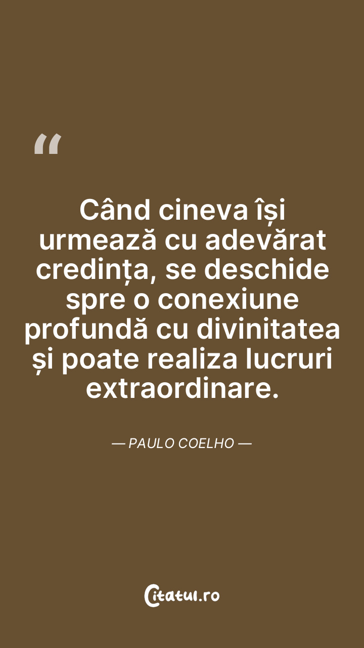 Când cineva își urmează cu adevărat credința, se deschide spre o conexiune profundă cu divinitatea și poate realiza lucruri extraordinare. Paulo Coelho