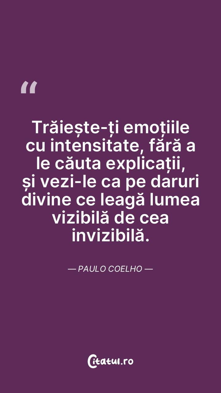 Trăiește-ți emoțiile cu intensitate, fără a le căuta explicații, și vezi-le ca pe daruri divine ce leagă lumea vizibilă de cea invizibilă. Paulo Coelho
