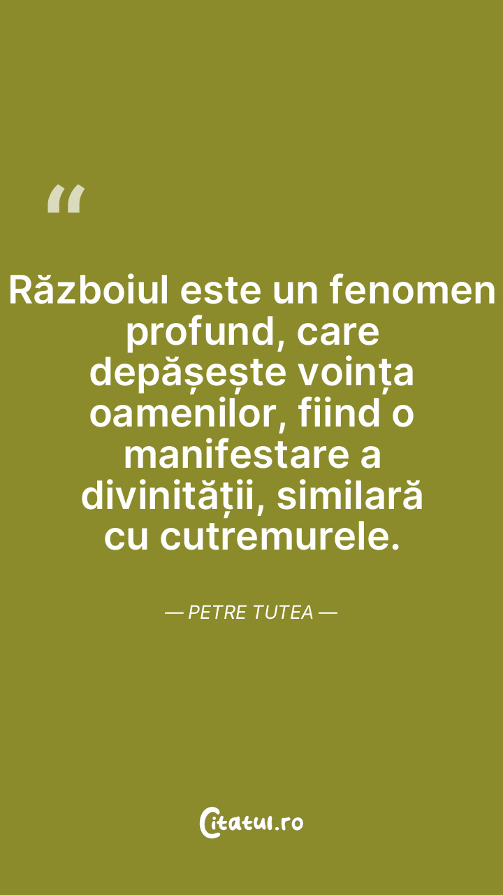 Războiul este un fenomen profund, care depășește voința oamenilor, fiind o manifestare a divinității, similară cu cutremurele. Petre Tutea