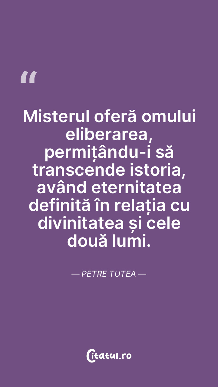 Misterul oferă omului eliberarea, permițându-i să transcende istoria, având eternitatea definită în relația cu divinitatea și cele două lumi. Petre Tutea