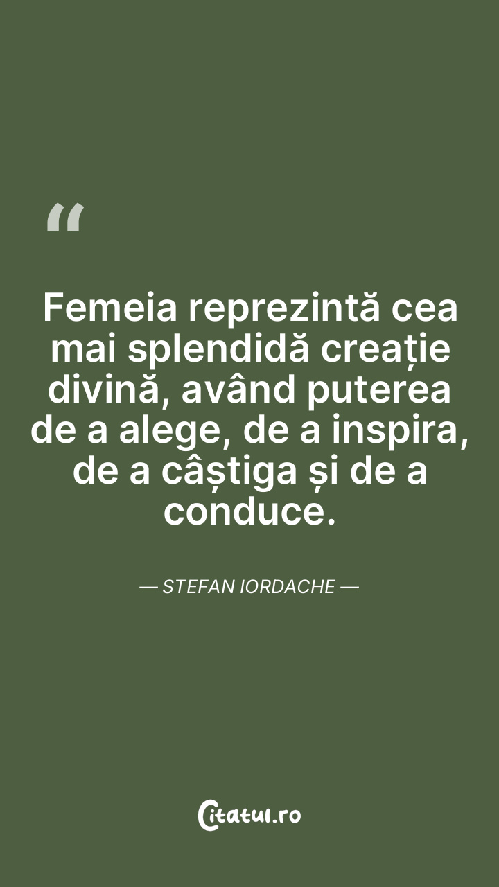 Femeia reprezintă cea mai splendidă creație divină, având puterea de a alege, de a inspira, de a câștiga și de a conduce. Stefan Iordache