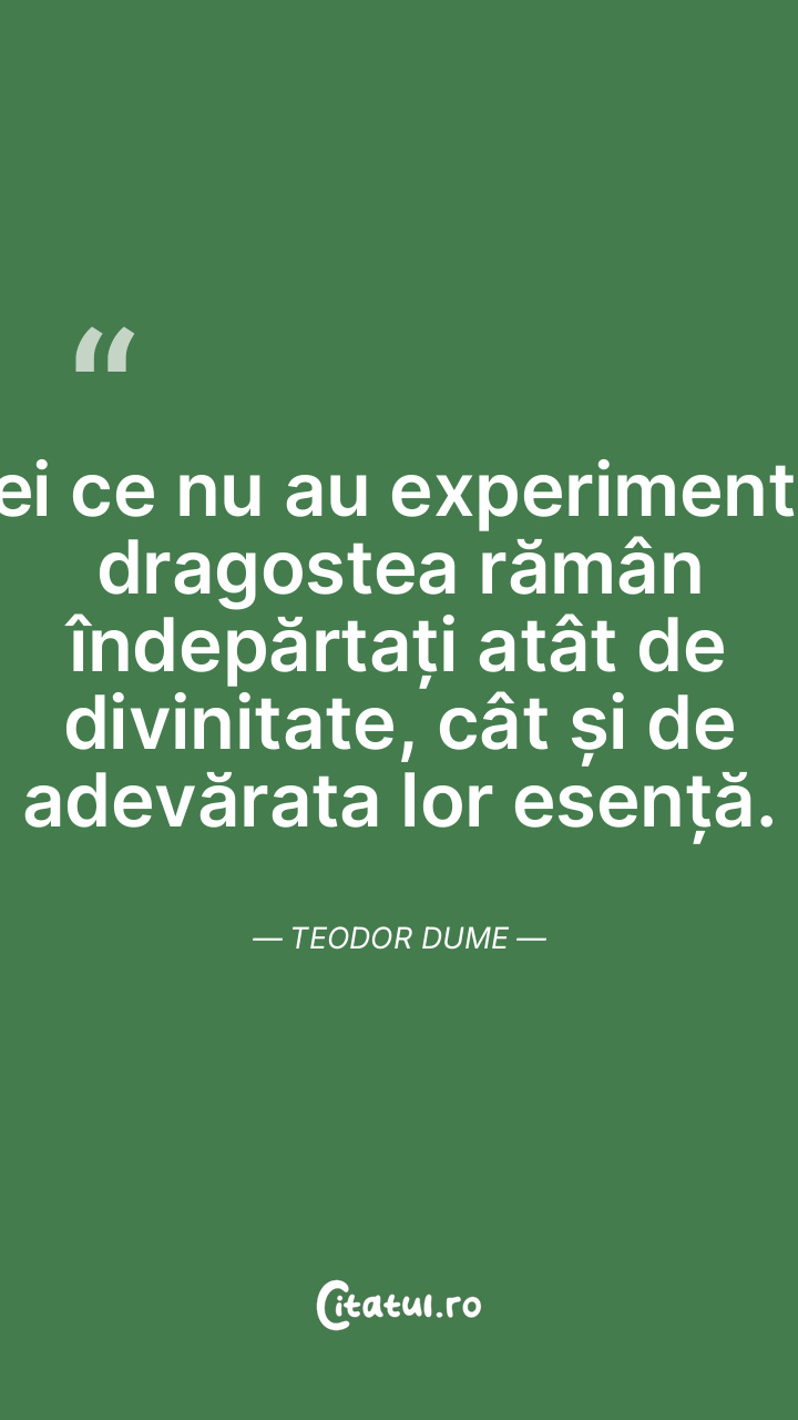 Cei ce nu au experimentat dragostea rămân îndepărtați atât de divinitate, cât și de adevărata lor esență. Teodor Dume