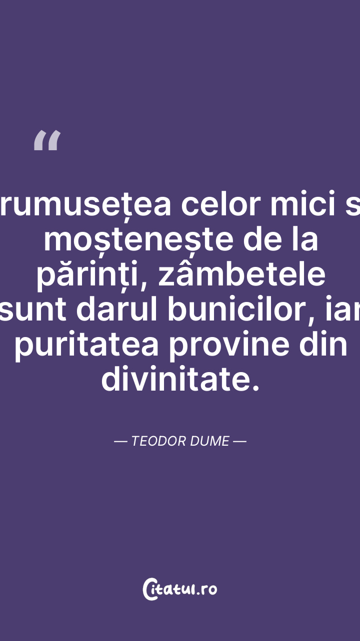 Frumusețea celor mici se moștenește de la părinți, zâmbetele sunt darul bunicilor, iar puritatea provine din divinitate. Teodor Dume