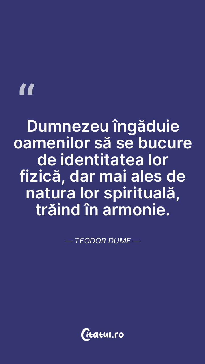 Dumnezeu îngăduie oamenilor să se bucure de identitatea lor fizică, dar mai ales de natura lor spirituală, trăind în armonie. Teodor Dume