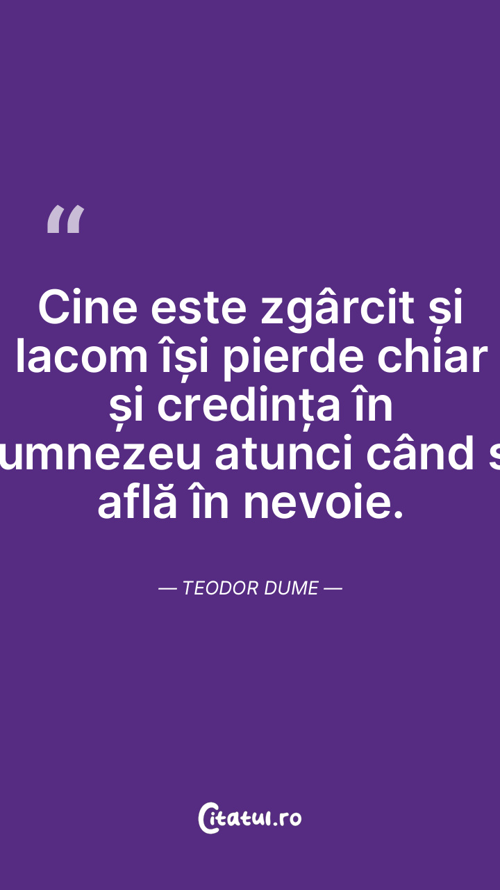 Cine este zgârcit și lacom își pierde chiar și credința în Dumnezeu atunci când se află în nevoie. Teodor Dume