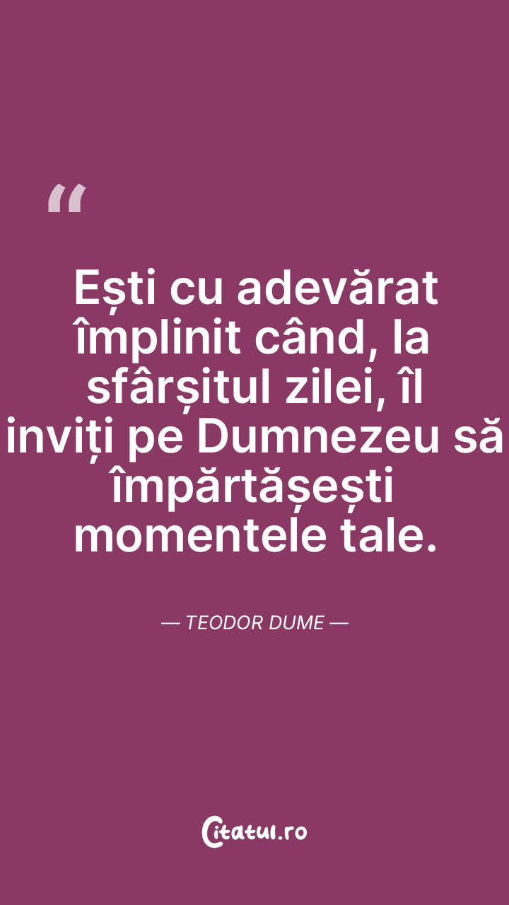Ești cu adevărat împlinit când, la sfârșitul zilei, îl inviți pe Dumnezeu să împărtășești momentele tale. Teodor Dume