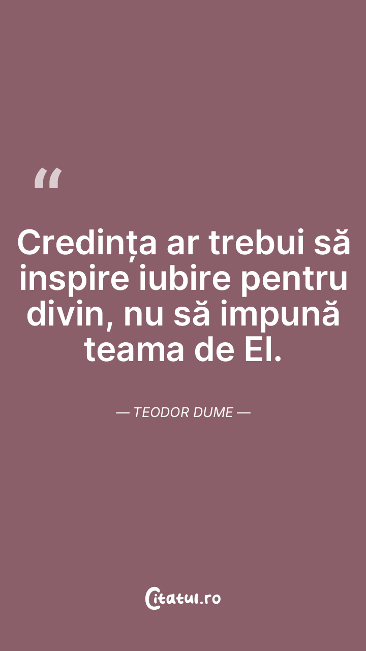 Credința ar trebui să inspire iubire pentru divin, nu să impună teama de El. Teodor Dume