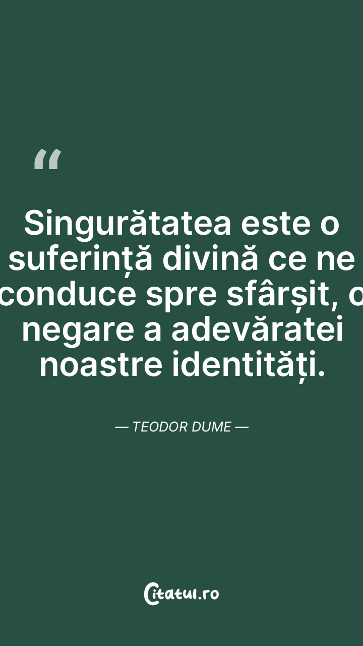 Singurătatea este o suferință divină ce ne conduce spre sfârșit, o negare a adevăratei noastre identități. Teodor Dume