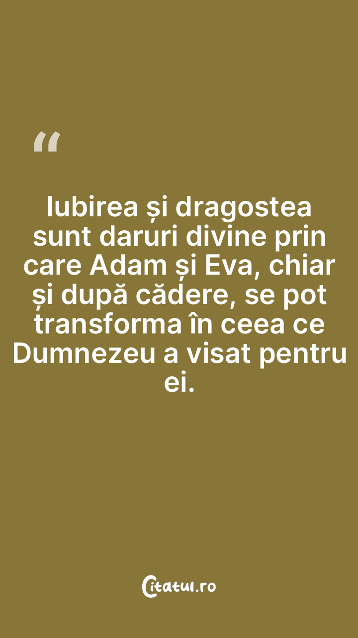 Iubirea și dragostea sunt daruri divine prin care Adam și Eva, chiar și după cădere, se pot transforma în ceea ce Dumnezeu a visat pentru ei.