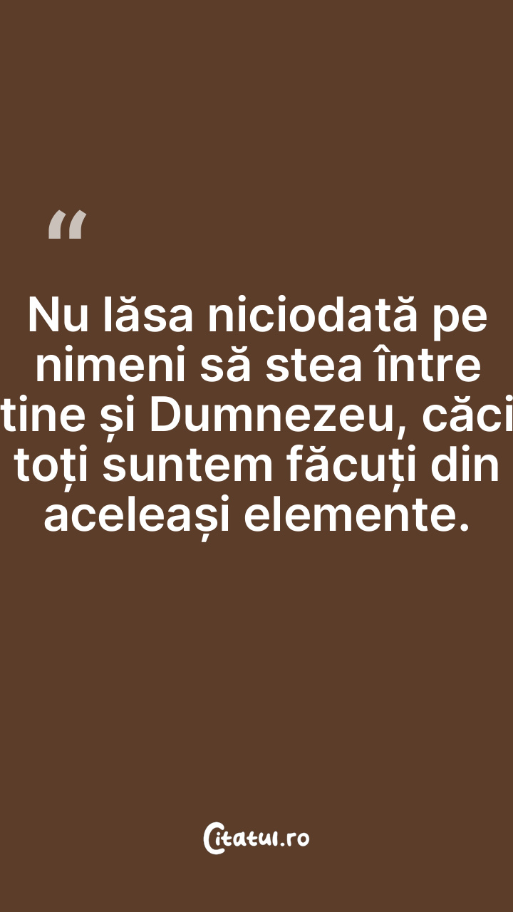 Nu lăsa niciodată pe nimeni să stea între tine și Dumnezeu, căci toți suntem făcuți din aceleași elemente.