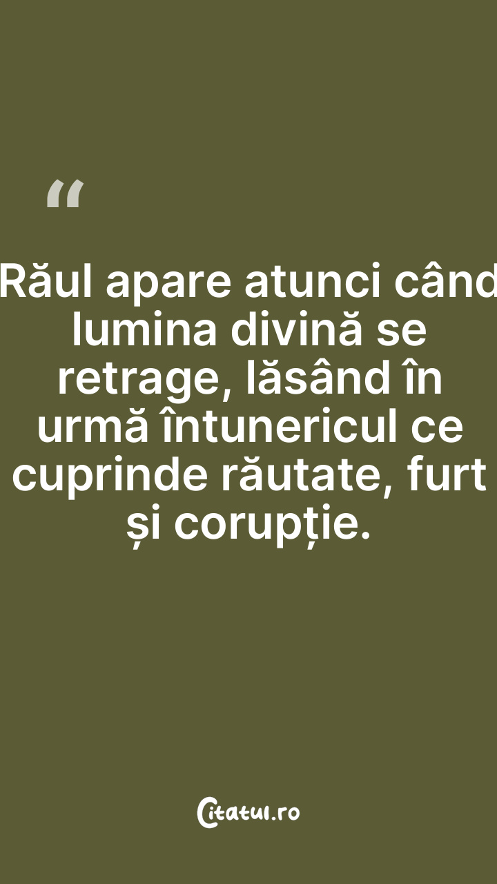 Răul apare atunci când lumina divină se retrage, lăsând în urmă întunericul ce cuprinde răutate, furt și corupție.
