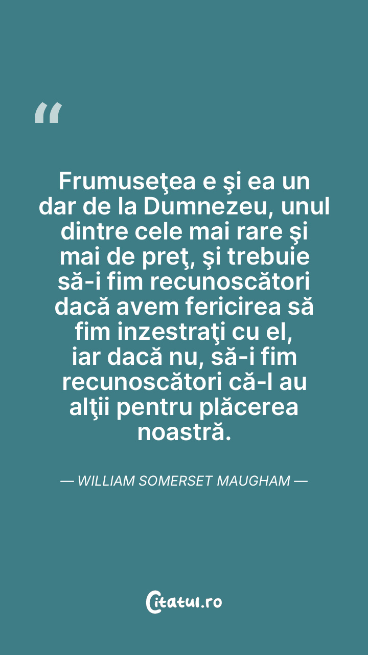 Frumuseţea e şi ea un dar de la Dumnezeu, unul dintre cele mai rare şi mai de preţ, şi trebuie să-i fim recunoscători dacă avem fericirea să fim inzestraţi cu el, iar dacă nu, să-i fim recunoscători că-l au alţii pentru plăcerea noastră. William Somerset Maugham
