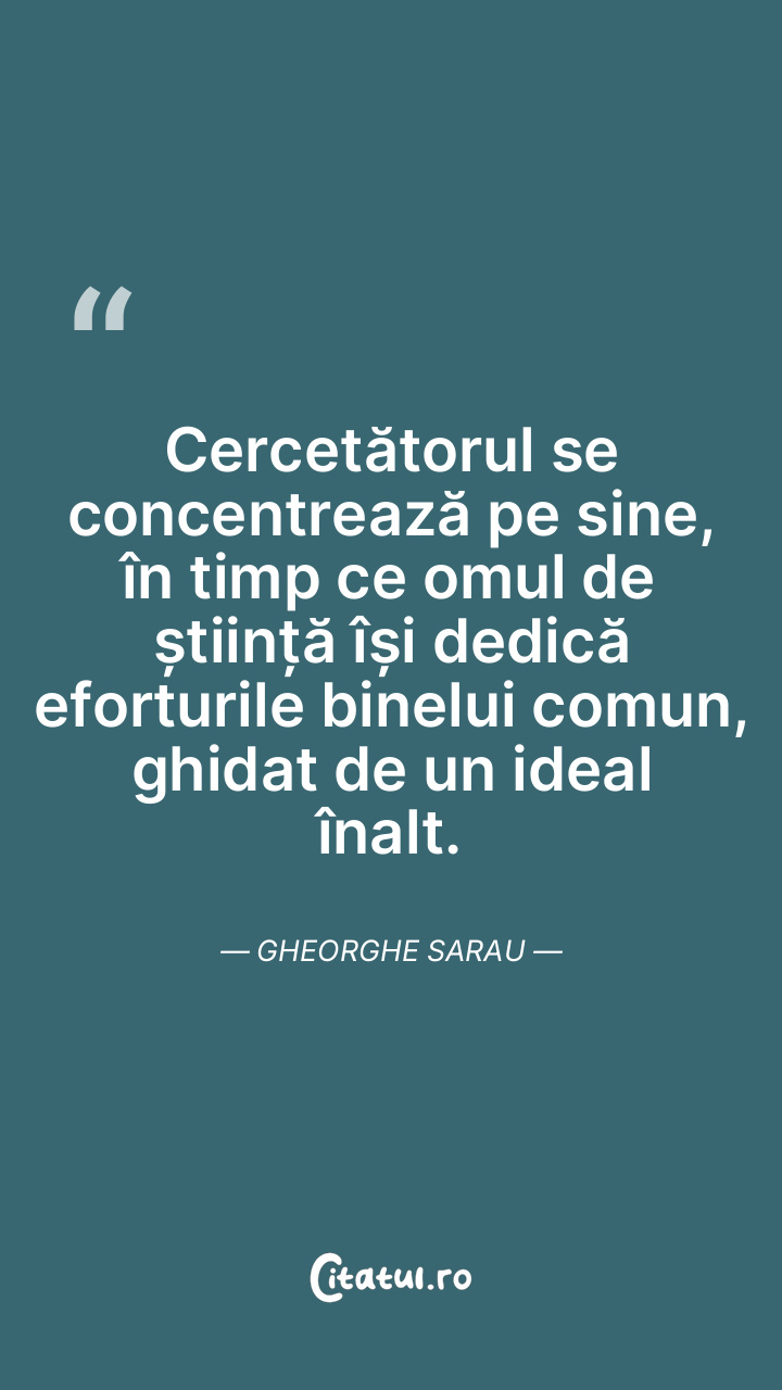 Cercetătorul se concentrează pe sine, în timp ce omul de știință își dedică eforturile binelui comun, ghidat de un ideal înalt. Gheorghe Sarau