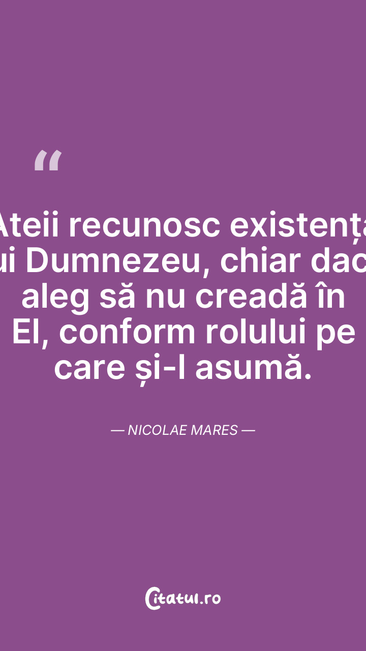 Ateii recunosc existența lui Dumnezeu, chiar dacă aleg să nu creadă în El, conform rolului pe care și-l asumă. Nicolae Mares