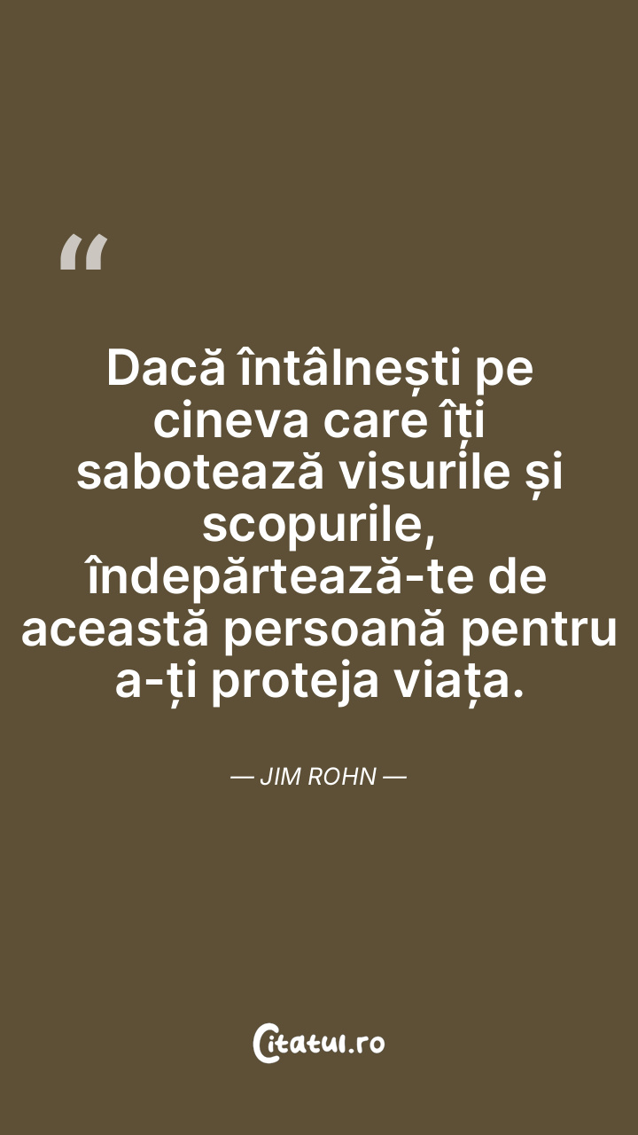 Dacă întâlnești pe cineva care îți sabotează visurile și scopurile, îndepărtează-te de această persoană pentru a-ți proteja viața. Jim Rohn
