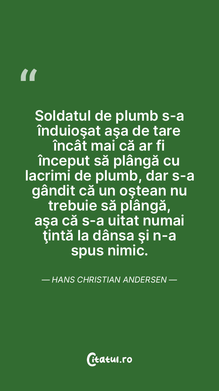 Soldatul de plumb s-a înduioşat aşa de tare încât mai că ar fi început să plângă cu lacrimi de plumb, dar s-a gândit că un oştean nu trebuie să plângă, aşa că s-a uitat numai ţintă la dânsa şi n-a spus nimic. Hans Christian Andersen