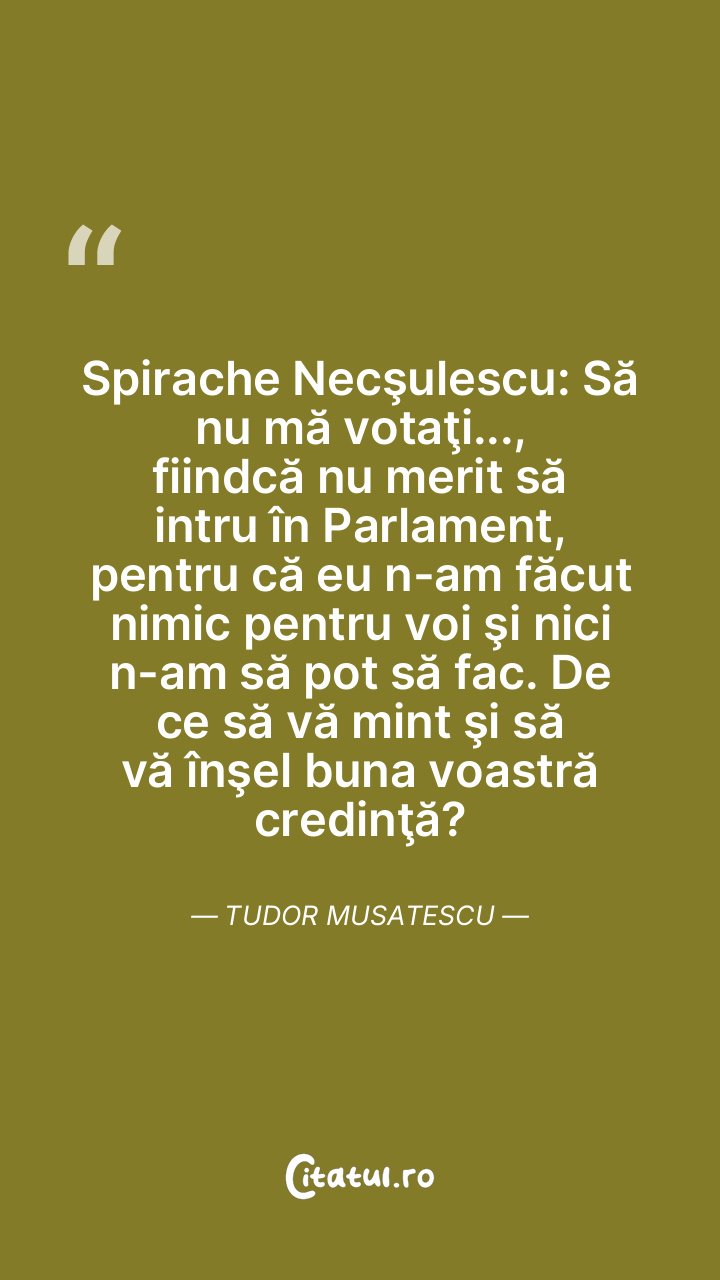 Spirache Necşulescu: Să nu mă votaţi..., fiindcă nu merit să intru în Parlament, pentru că eu n-am făcut nimic pentru voi şi nici n-am să pot să fac. De ce să vă mint şi să vă înşel buna voastră credinţă? Tudor Musatescu
