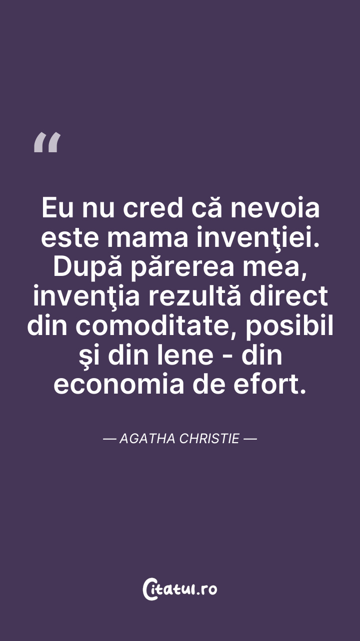 Eu nu cred că nevoia este mama invenţiei. După părerea mea, invenţia rezultă direct din comoditate, posibil şi din lene - din economia de efort. Agatha Christie