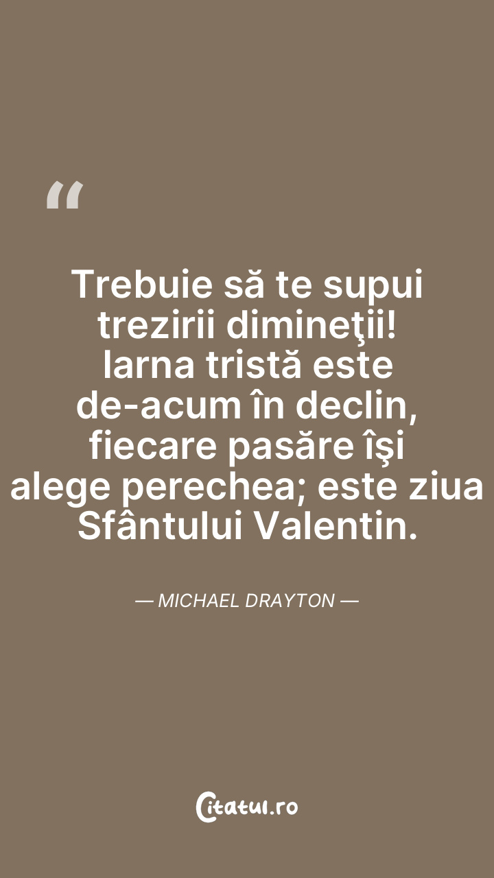 Trebuie să te supui trezirii dimineţii! Iarna tristă este de-acum în declin, fiecare pasăre îşi alege perechea; este ziua Sfântului Valentin. Michael Drayton