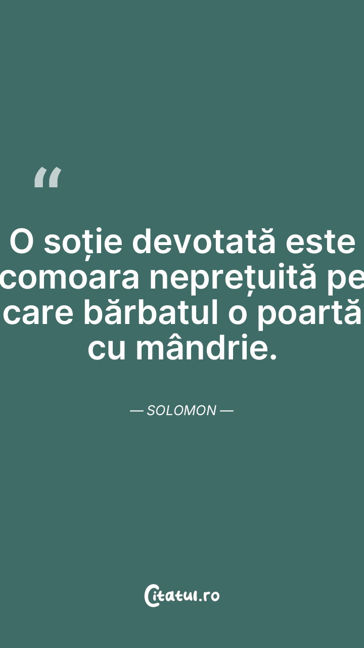 O soție devotată este comoara neprețuită pe care bărbatul o poartă cu mândrie. Solomon