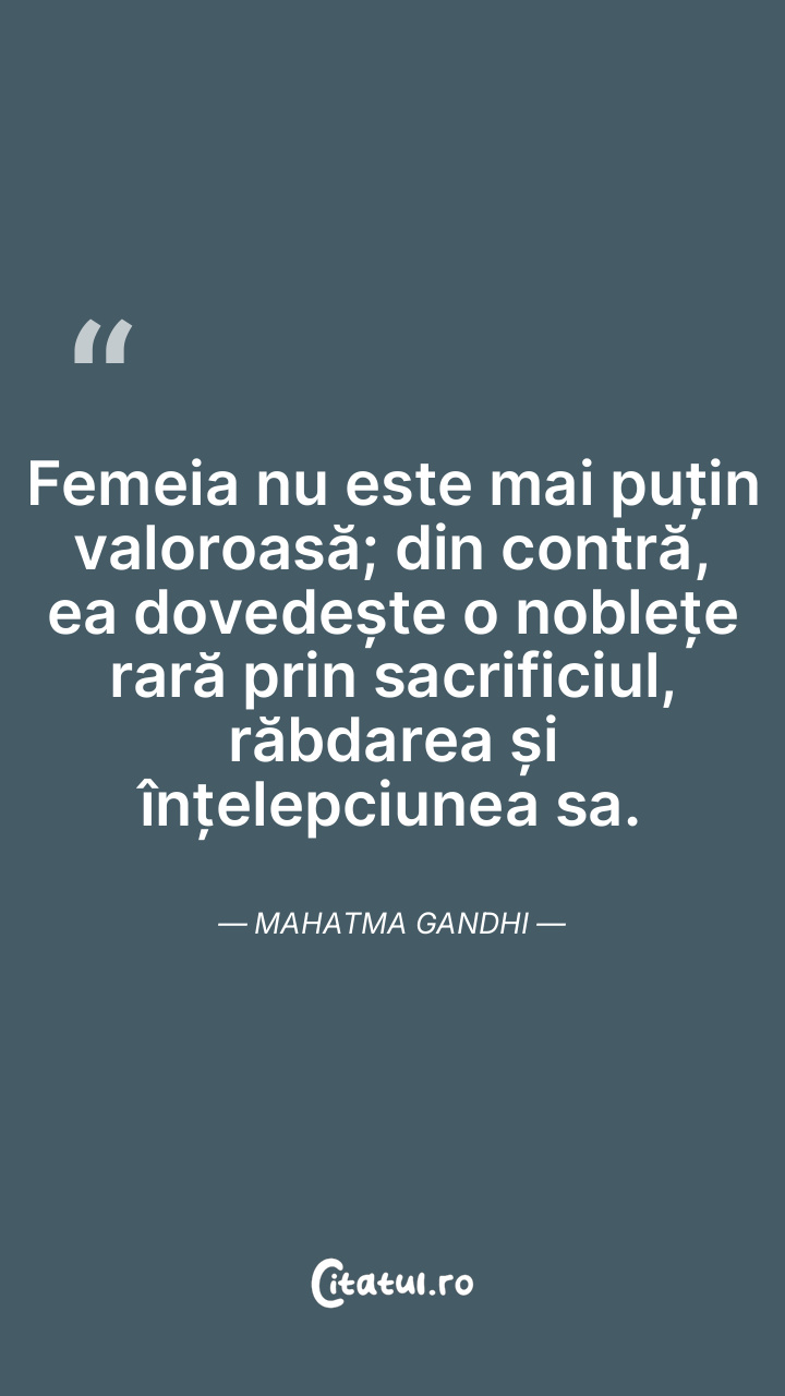 Femeia nu este mai puțin valoroasă; din contră, ea dovedește o noblețe rară prin sacrificiul, răbdarea și înțelepciunea sa. Mahatma Gandhi