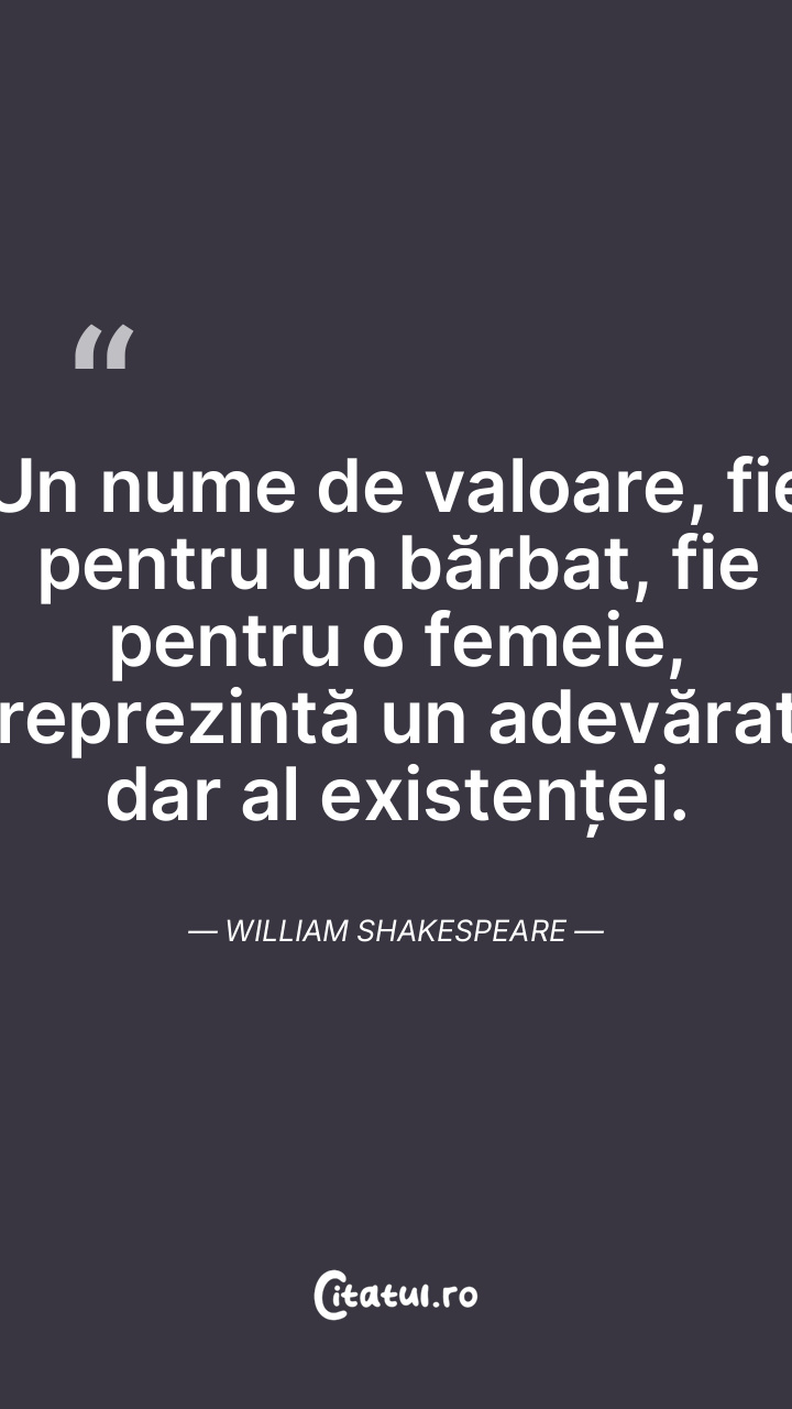 Un nume de valoare, fie pentru un bărbat, fie pentru o femeie, reprezintă un adevărat dar al existenței. William Shakespeare
