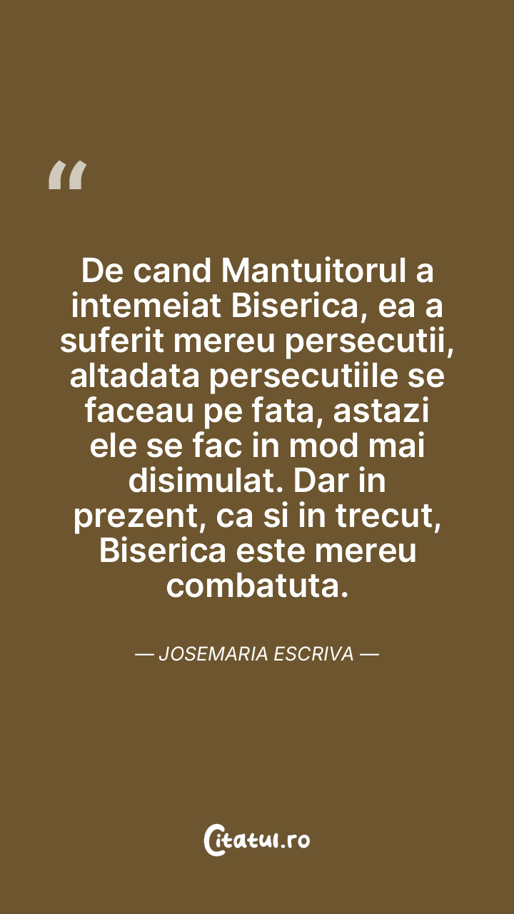 De cand Mantuitorul a intemeiat Biserica, ea a suferit mereu persecutii, altadata persecutiile se faceau pe fata, astazi ele se fac in mod mai disimulat. Dar in prezent, ca si in trecut, Biserica este mereu combatuta. Josemaria Escriva