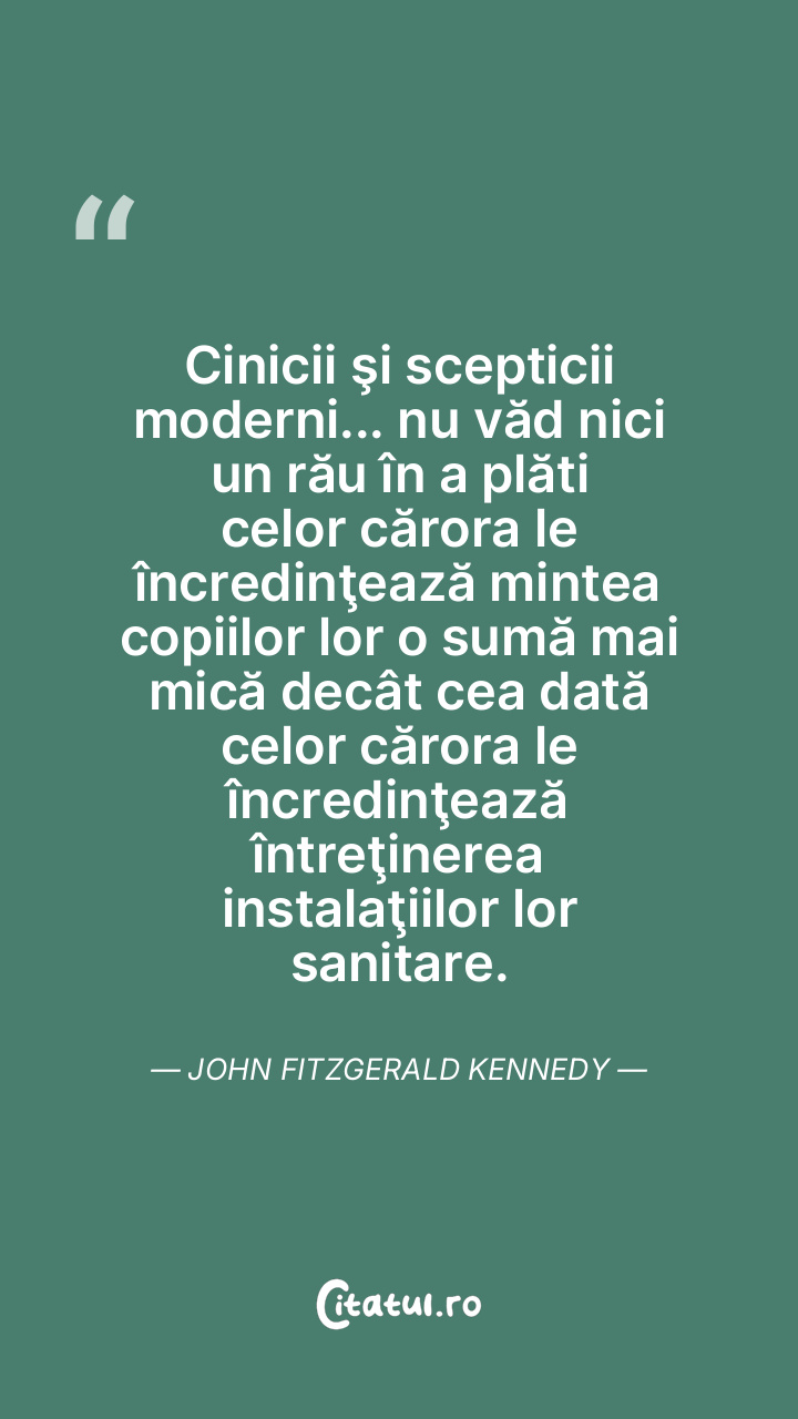 Cinicii şi scepticii moderni... nu văd nici un rău în a plăti celor cărora le încredinţează mintea copiilor lor o sumă mai mică decât cea dată celor cărora le încredinţează întreţinerea instalaţiilor lor sanitare. John Fitzgerald Kennedy