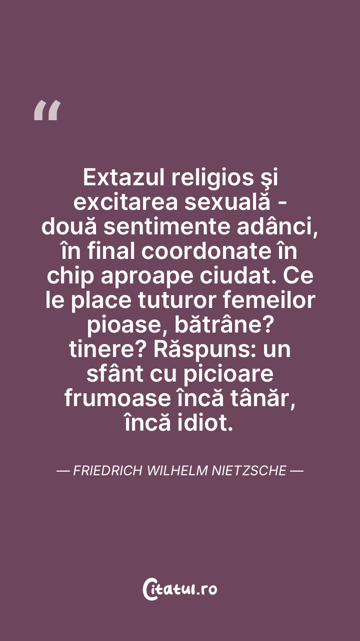 Extazul religios şi excitarea sexuală - două sentimente adânci, în final coordonate în chip aproape ciudat. Ce le place tuturor femeilor pioase, bătrâne? tinere? Răspuns: un sfânt cu picioare frumoase încă tânăr, încă idiot. Friedrich Wilhelm Nietzsche