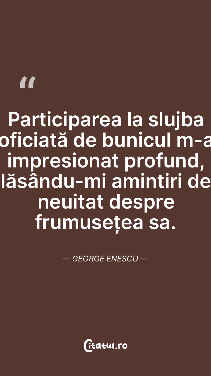 Participarea la slujba oficiată de bunicul m-a impresionat profund, lăsându-mi amintiri de neuitat despre frumusețea sa. George Enescu