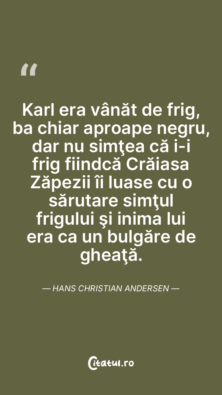Karl era vânăt de frig, ba chiar aproape negru, dar nu simţea că i-i frig fiindcă Crăiasa Zăpezii îi luase cu o sărutare simţul frigului şi inima lui era ca un bulgăre de gheaţă. Hans Christian Andersen