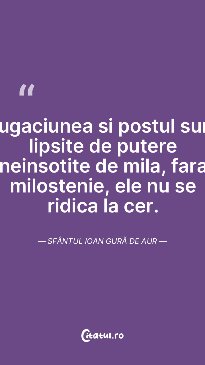 Rugaciunea si postul sunt lipsite de putere neinsotite de mila, fara milostenie, ele nu se ridica la cer. Sfântul Ioan Gură de Aur