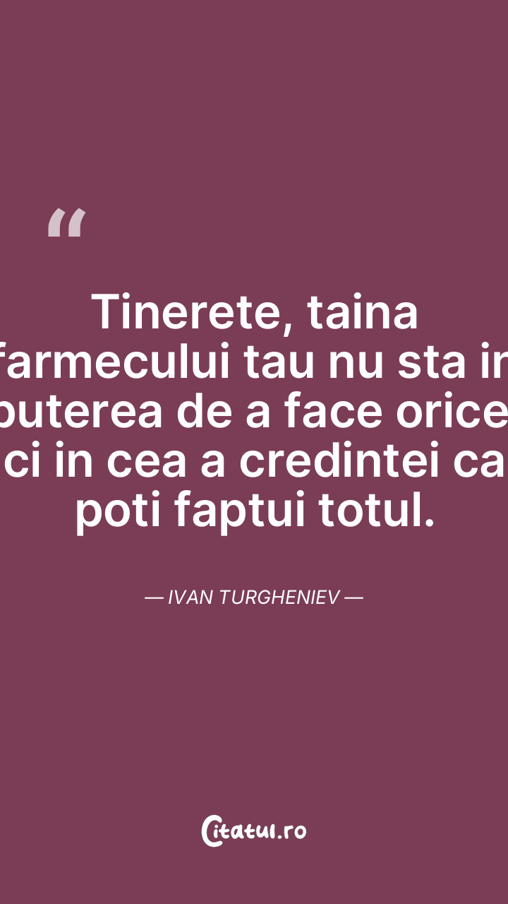 Tinerete, taina farmecului tau nu sta in puterea de a face orice, ci in cea a credintei ca poti faptui totul. Ivan Turgheniev