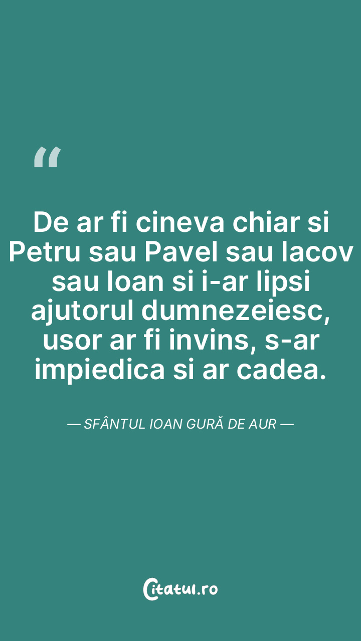 De ar fi cineva chiar si Petru sau Pavel sau Iacov sau Ioan si i-ar lipsi ajutorul dumnezeiesc, usor ar fi invins, s-ar impiedica si ar cadea. Sfântul Ioan Gură de Aur