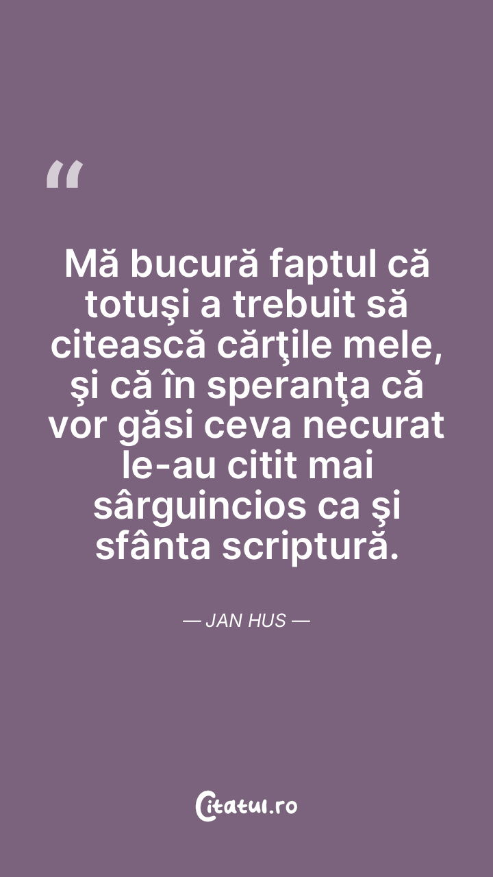 Mă bucură faptul că totuşi a trebuit să citească cărţile mele, şi că în speranţa că vor găsi ceva necurat le-au citit mai sârguincios ca şi sfânta scriptură. Jan Hus