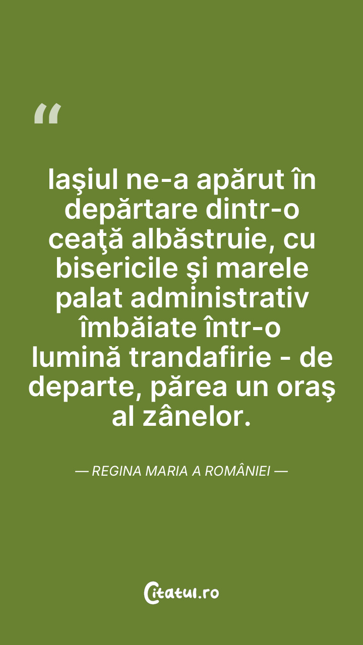 Iaşiul ne-a apărut în depărtare dintr-o ceaţă albăstruie, cu bisericile şi marele palat administrativ îmbăiate într-o lumină trandafirie - de departe, părea un oraş al zânelor. Regina Maria a României