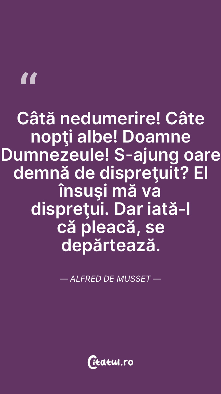 Câtă nedumerire! Câte nopţi albe! Doamne Dumnezeule! S-ajung oare demnă de dispreţuit? El însuşi mă va dispreţui. Dar iată-l că pleacă, se depărtează. Alfred de Musset