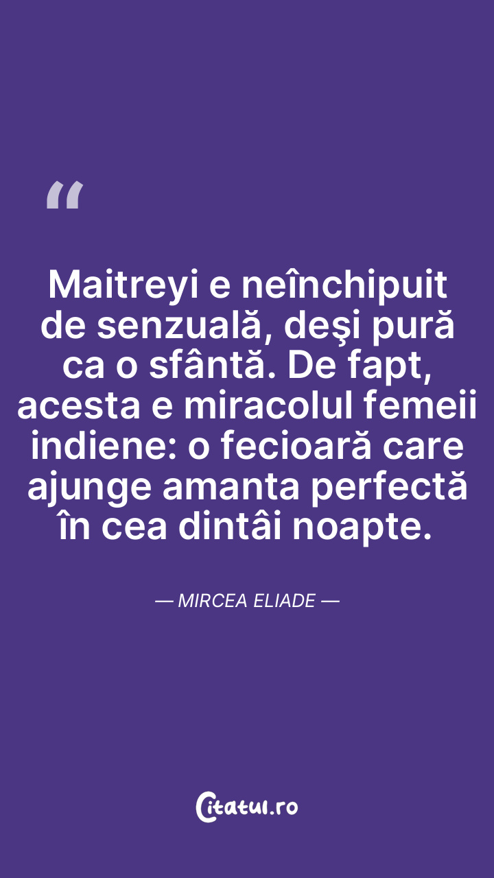 Maitreyi e neînchipuit de senzuală, deşi pură ca o sfântă. De fapt, acesta e miracolul femeii indiene: o fecioară care ajunge amanta perfectă în cea dintâi noapte. Mircea Eliade