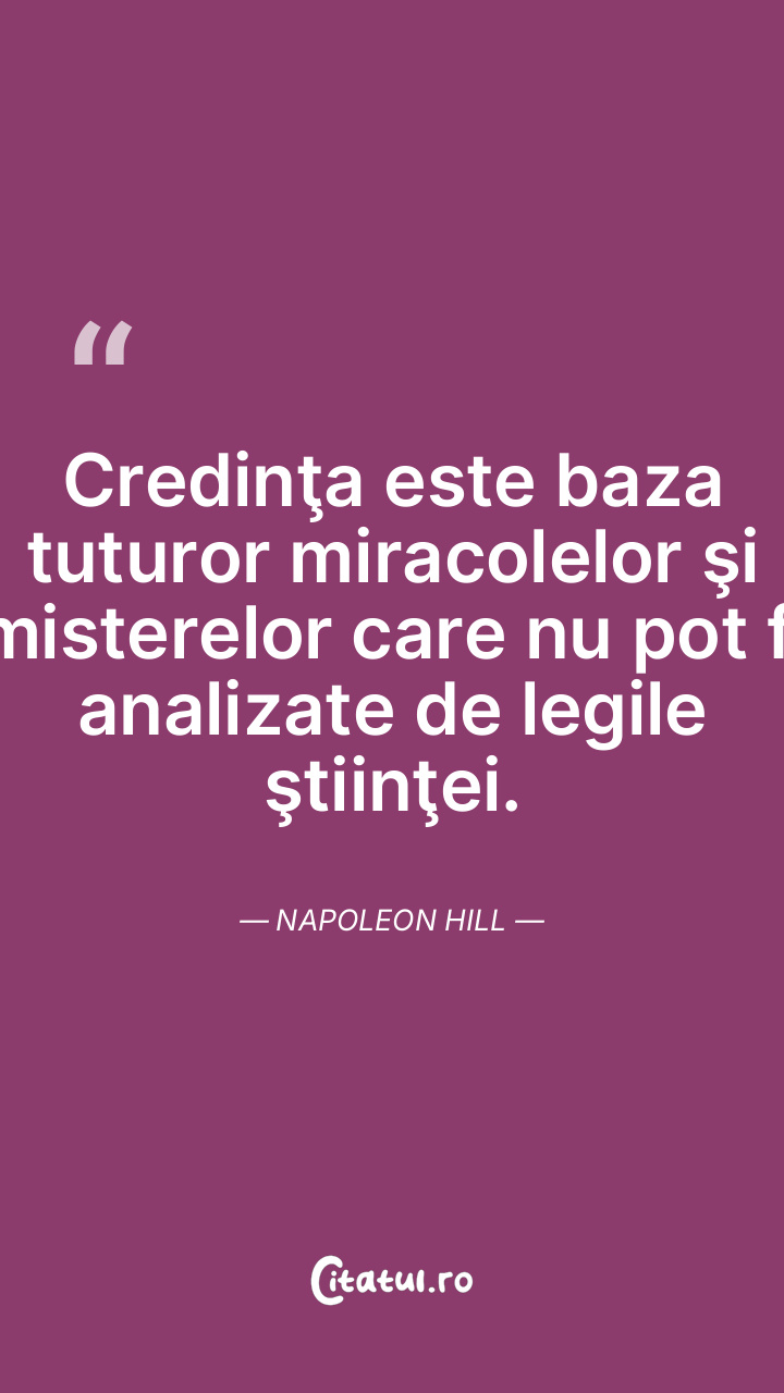Credinţa este baza tuturor miracolelor şi misterelor care nu pot fi analizate de legile ştiinţei. Napoleon Hill