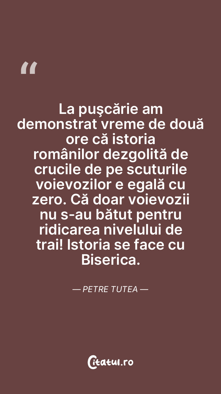 La puşcărie am demonstrat vreme de două ore că istoria românilor dezgolită de crucile de pe scuturile voievozilor e egală cu zero. Că doar voievozii nu s-au bătut pentru ridicarea nivelului de trai! Istoria se face cu Biserica. Petre Tutea