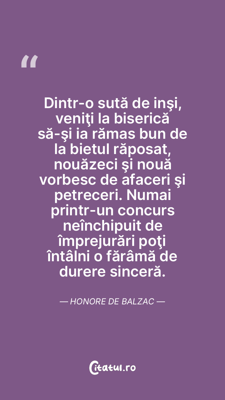 Dintr-o sută de inşi, veniţi la biserică să-şi ia rămas bun de la bietul răposat, nouăzeci şi nouă vorbesc de afaceri şi petreceri. Numai printr-un concurs neînchipuit de împrejurări poţi întâlni o fărâmă de durere sinceră. Honore de Balzac