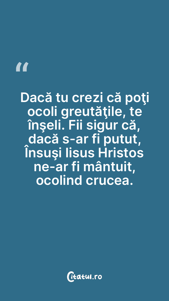 Dacă tu crezi că poţi ocoli greutăţile, te înşeli. Fii sigur că, dacă s-ar fi putut, Însuşi Iisus Hristos ne-ar fi mântuit, ocolind crucea.