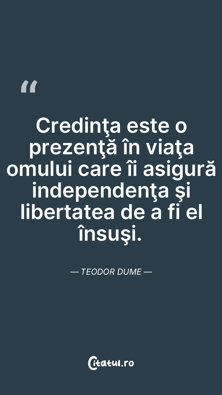Credinţa este o prezenţă în viaţa omului care îi asigură independenţa şi libertatea de a fi el însuşi. Teodor Dume