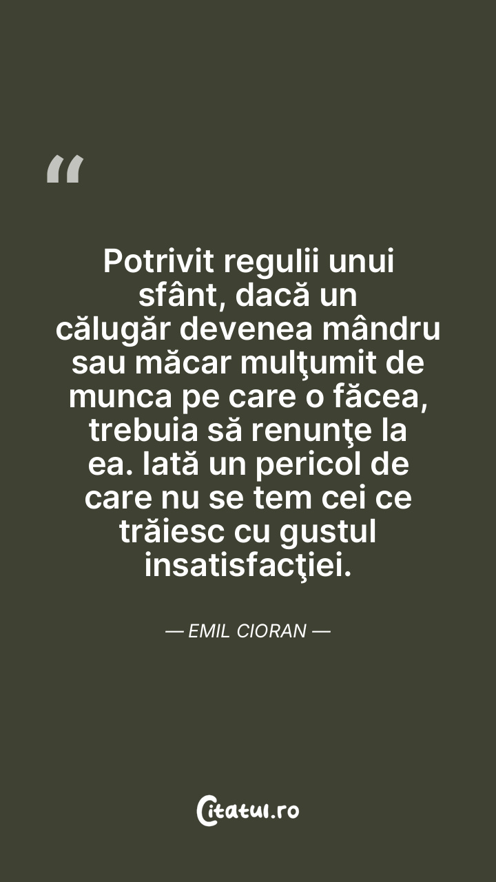 Potrivit regulii unui sfânt, dacă un călugăr devenea mândru sau măcar mulţumit de munca pe care o făcea, trebuia să renunţe la ea. Iată un pericol de care nu se tem cei ce trăiesc cu gustul insatisfacţiei. Emil Cioran
